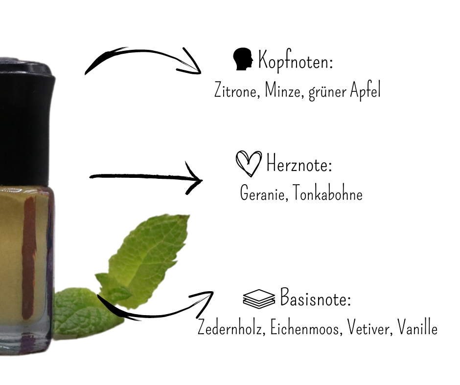 Die Kopfnote besteht aus zitrischen Noten von Zitrone, Minze und grünem Apfel, die sofort erfrischen und beleben.