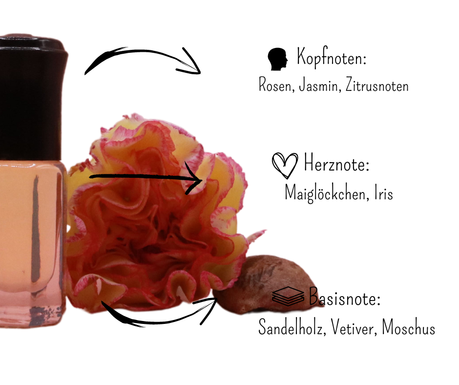Die Kopfnote eröffnet mit einem bezaubernden Bouquet aus zarten Rosen und Jasmin, die eine romantische und sinnliche Atmosphäre schaffen.