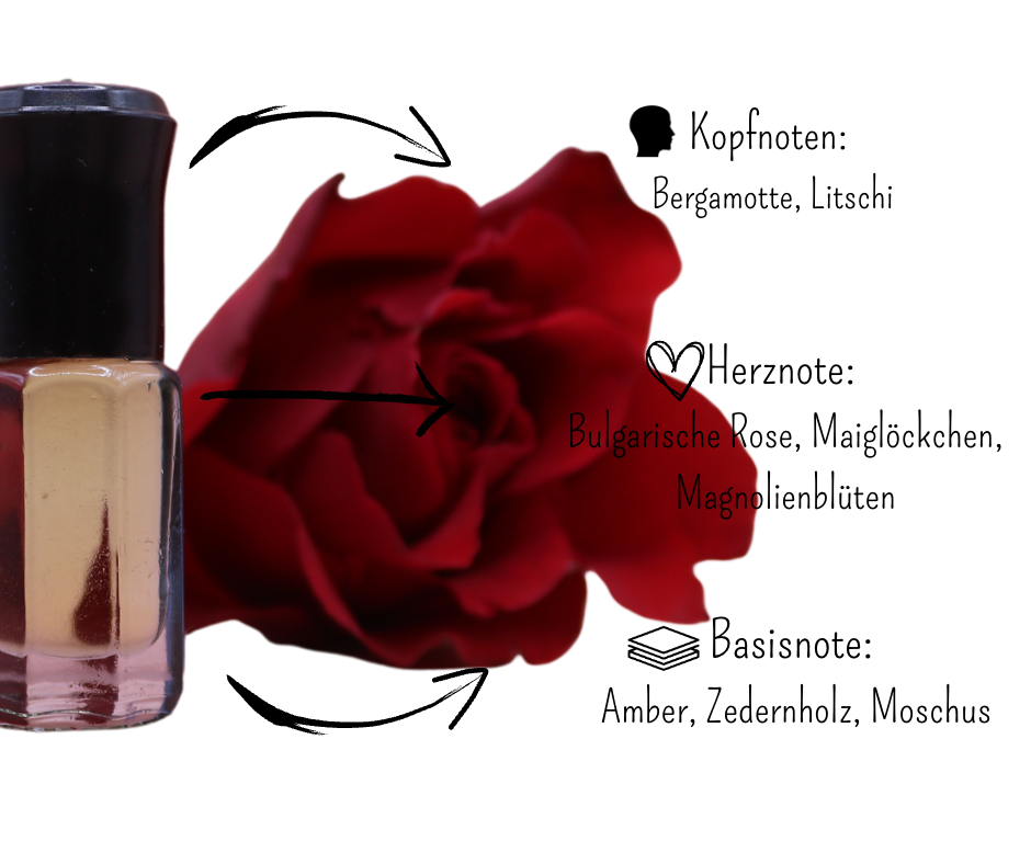 Im Herzen des Duftes entfaltet sich die sanfte Eleganz der bulgarischen Rose, die von einem Hauch von Maiglöckchen begleitet wird. Diese florale Melodie wird von einem betörenden Bouquet aus Magnolienblüten untermalt, das dem Duft seine romantische Aura verleiht.
